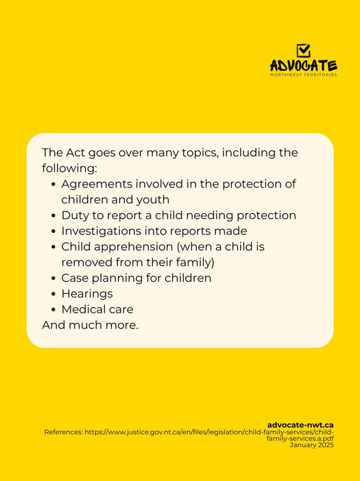 The NWT Child and Family Services Act requires the government to provide protective and support services to children and families. The Department of Health and Social Services is responsible for meeting these requirements.
